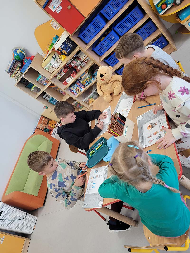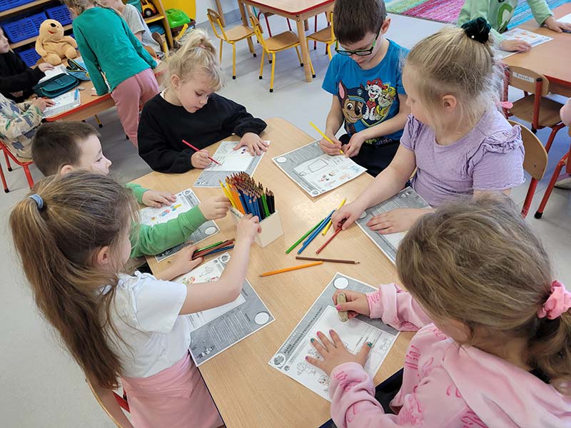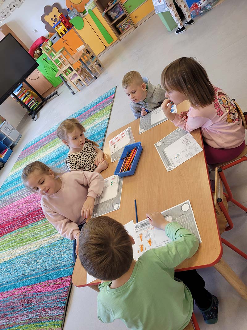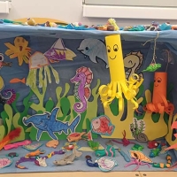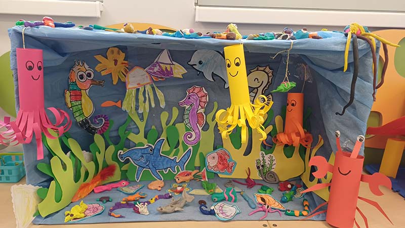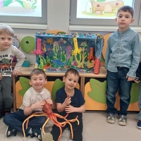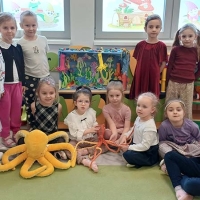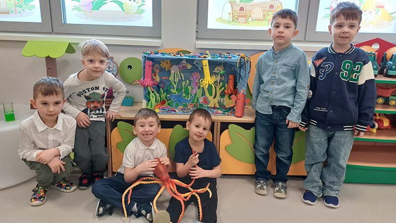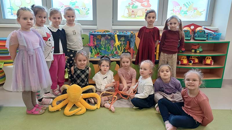 Dzieci stworzyły niezwykłą pracę plastyczną przedstawiającą tajemniczy podwodny świat oceanu. W ich kompozycji pojawiły się kolorowe rybki, meduzy, ośmiornice, koniki morskie oraz piękna rafa koralowa. Nie zabrakło również muszelek, fal i błękitnej wody, która otula wszystkie morskie stworzenia.