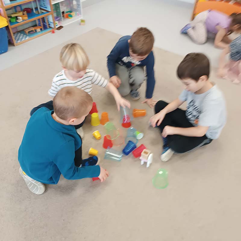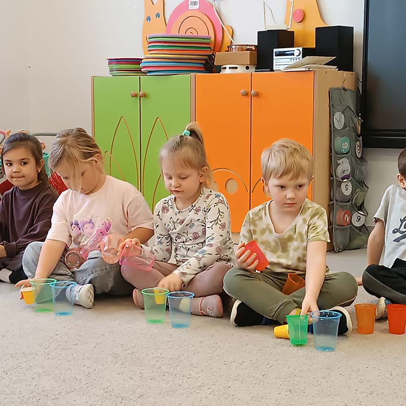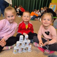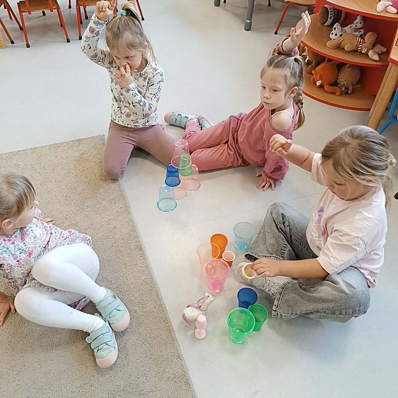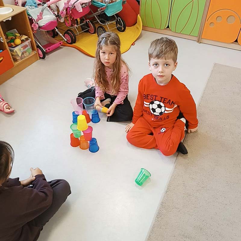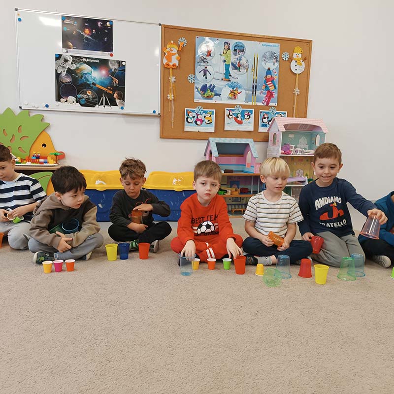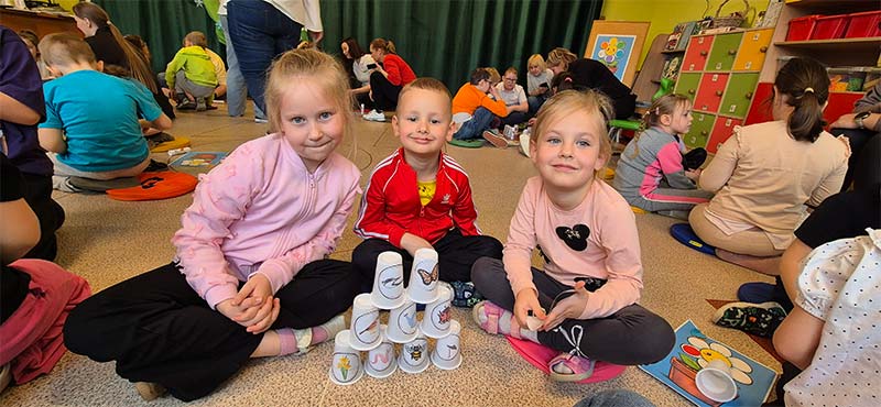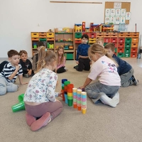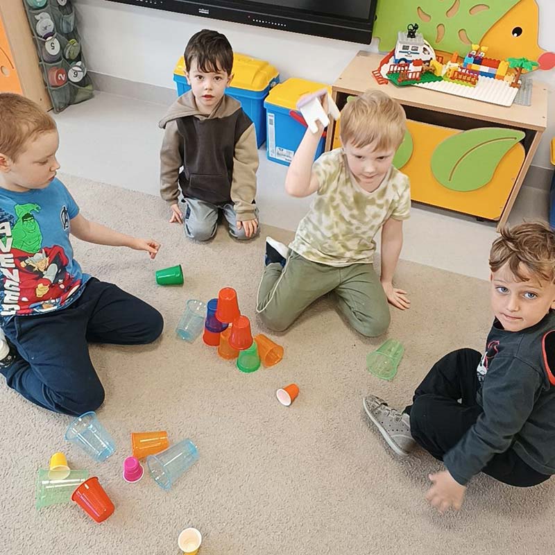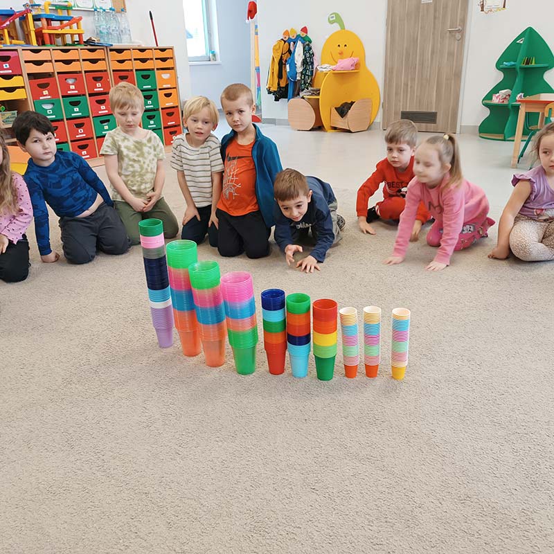 Zabawy matematyczne w grupie Motylków z wykorzystaniem kolorowych kubeczków. Dzieci porównywały wysokość wież, przeliczały kubeczki, tworzyły wieże według wzoru oraz doskonaliły umiejętność pracy w grupie.