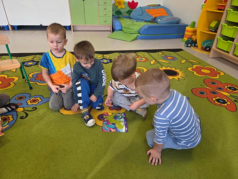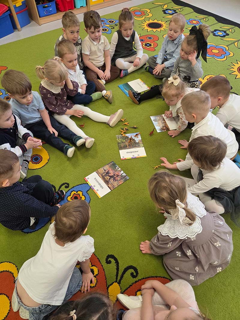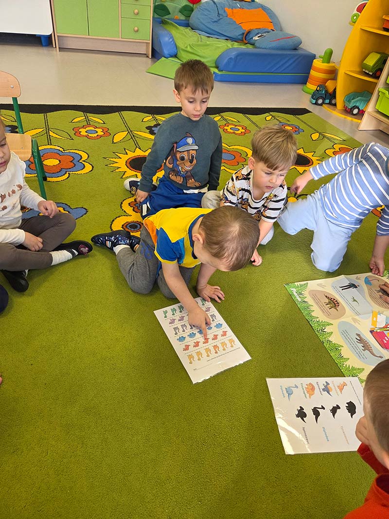 Biedroneczki podczas zajęć poznały temat dinozaurów. Oglądały ilustracje przedstawiające różne dinozaury, nazywały ich wygląd oraz rozmawiały o tym, gdzie żyły. Dzieci naśladowały ruchy dinozaurów, rozwijając sprawność ruchową i wyobraźnię. Na zakończenie wykonały prostą pracę plastyczną przedstawiającą dinozaura.
