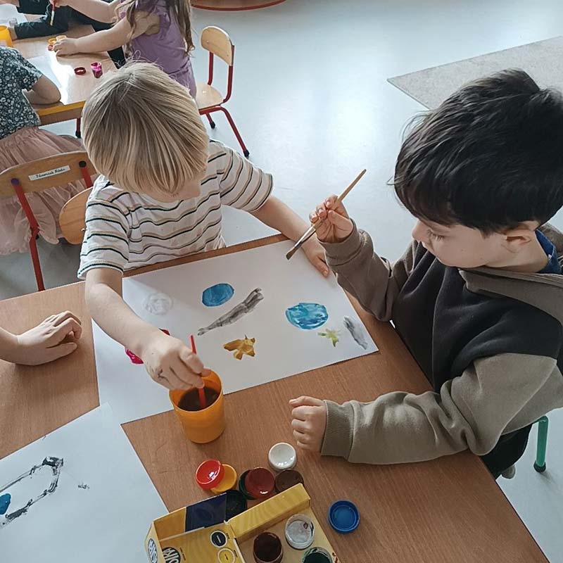 Dzieci z grupy Motylki doskonaliły umiejętność pracy w parach. Wspólnie namalowały kosmiczne obrazki.