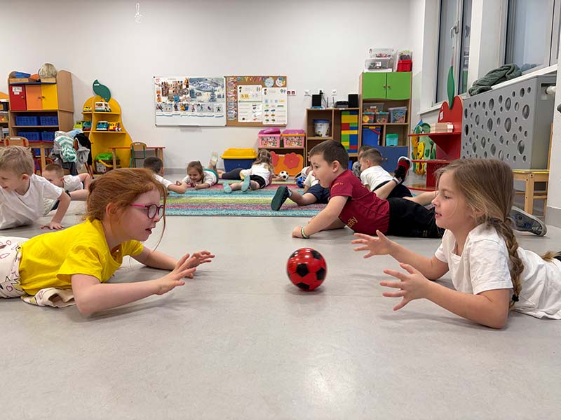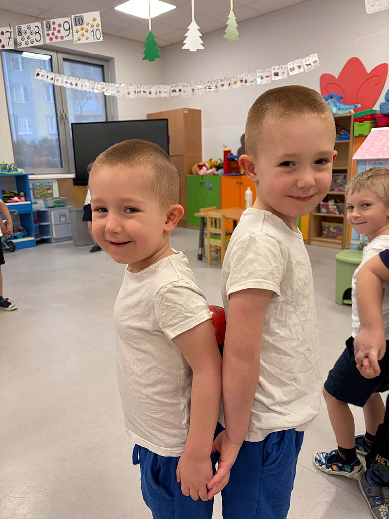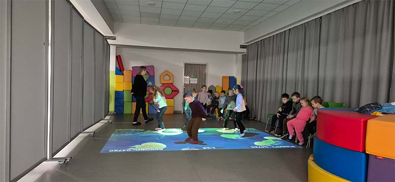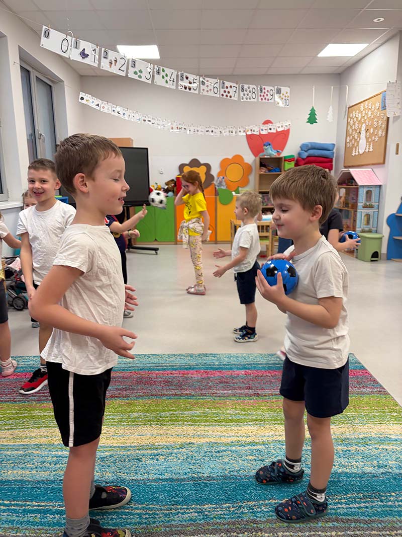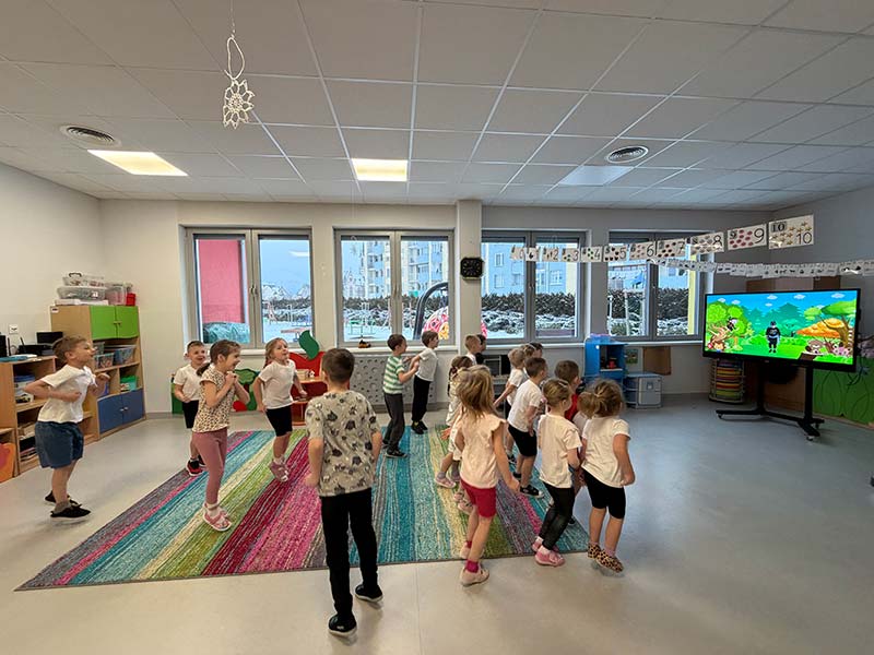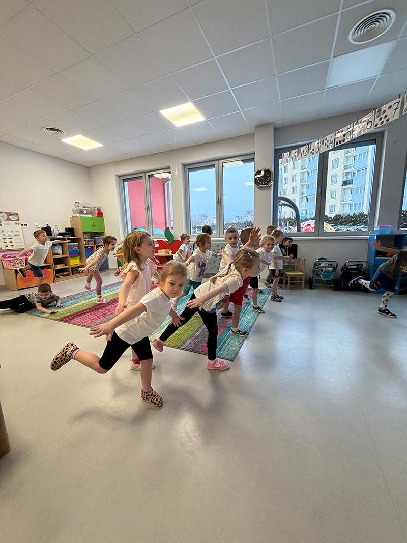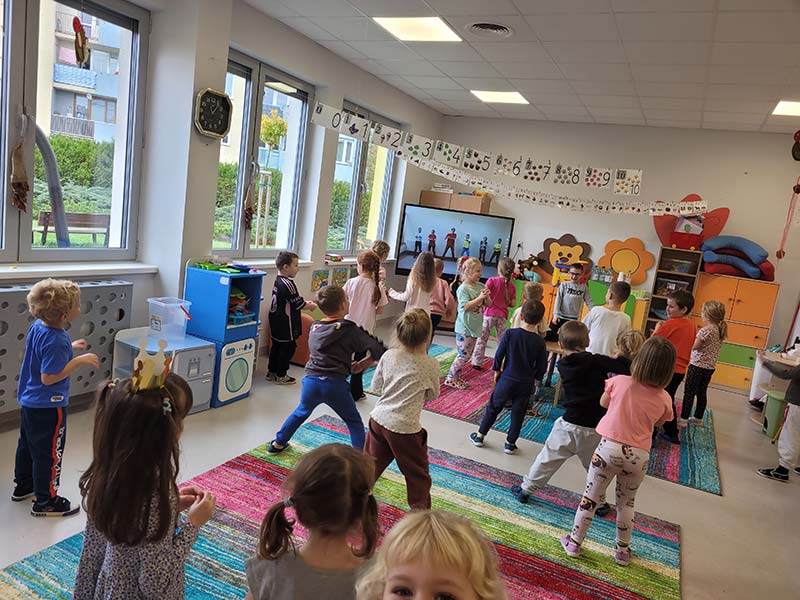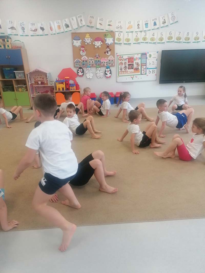 Czasem używamy sprzętu gimnastycznego, czasami zabaw bieżnych w sali gimnastycznej, a czasami korzystamy z tablicy interaktywnej.