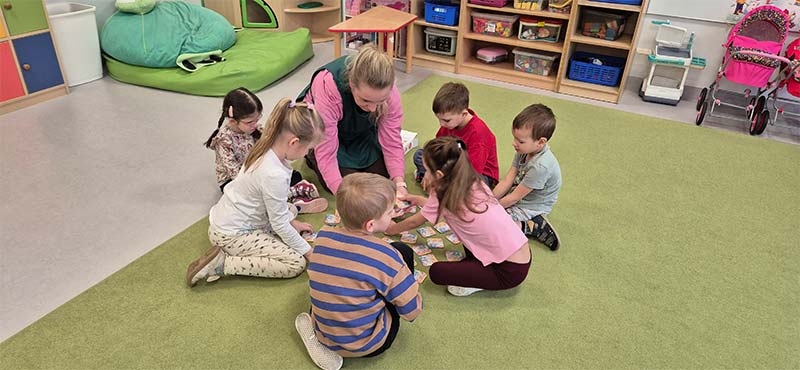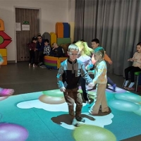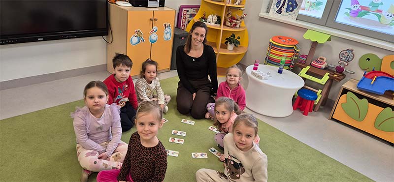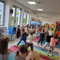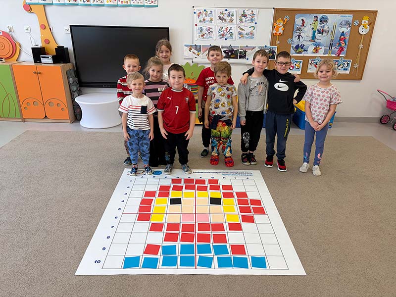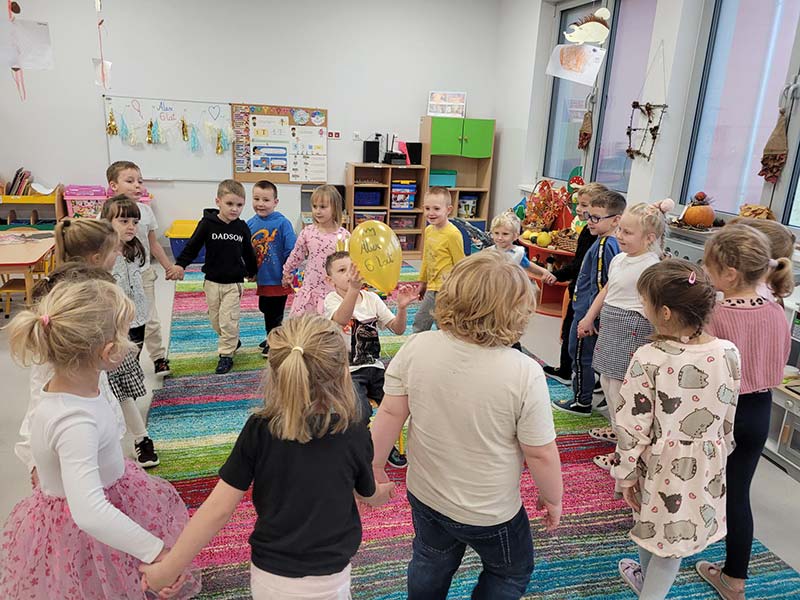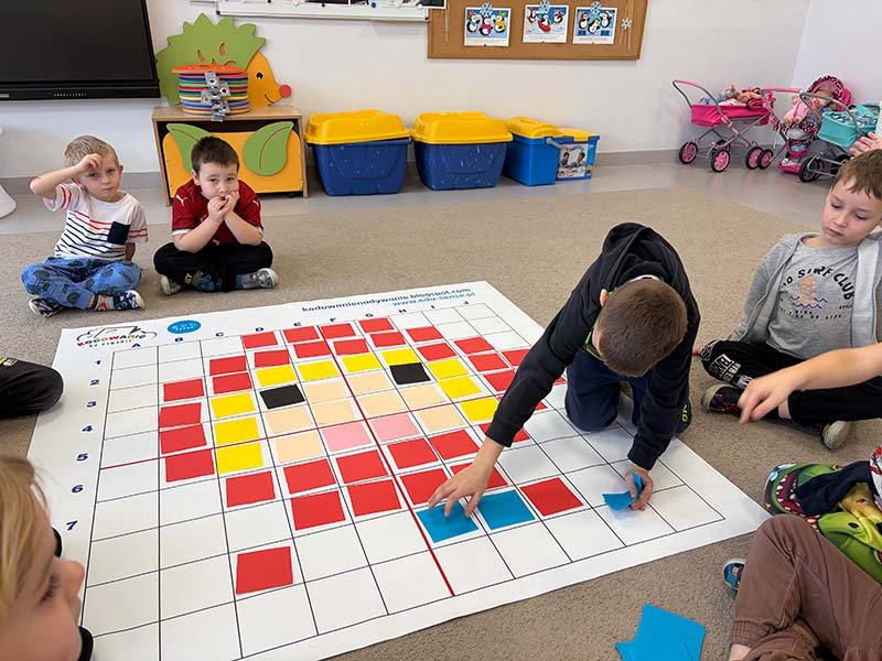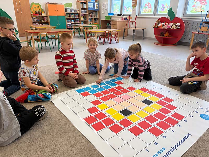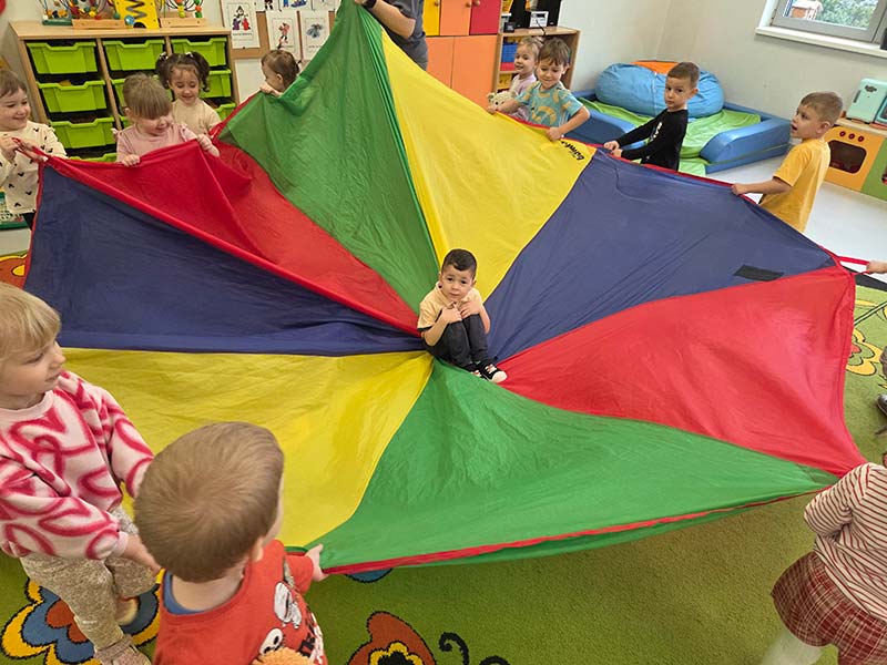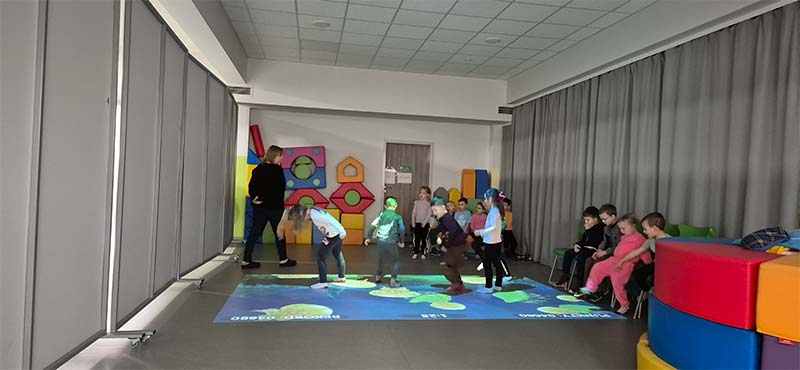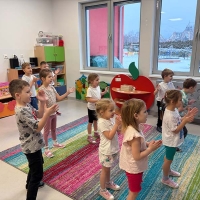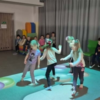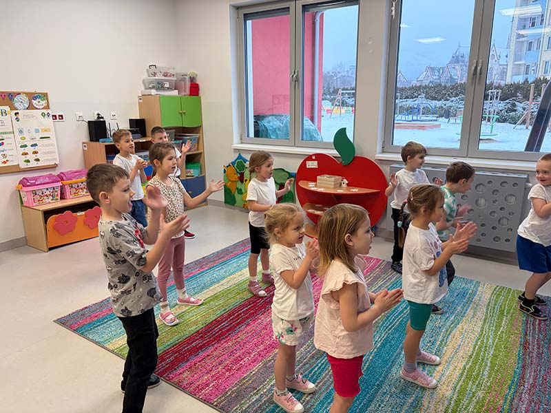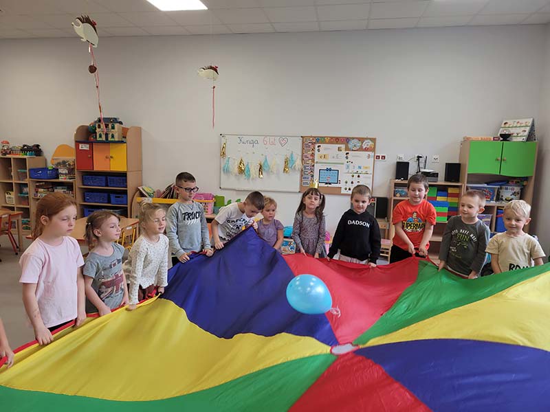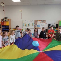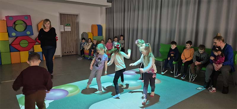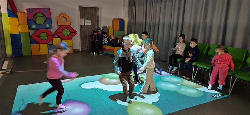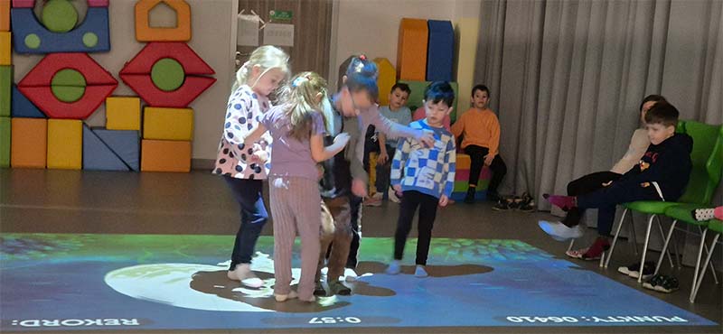 Czasem używamy sprzętu gimnastycznego, czasami zabaw bieżnych w sali gimnastycznej, a czasami korzystamy z tablicy interaktywnej.