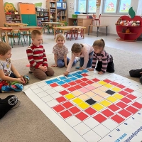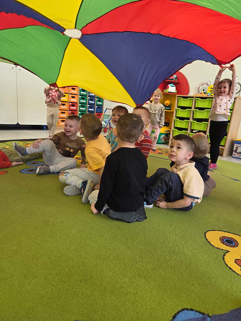Zabawy na czarodziejskim dywanie zawsze są cudowne i dzieci nie opuszcza uśmiech - grupa Jeżyki.