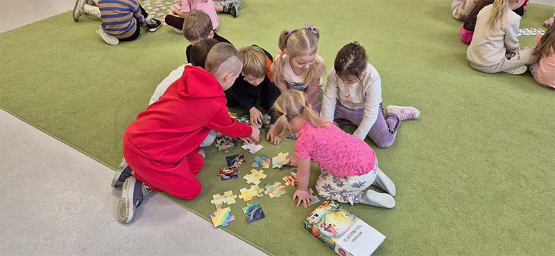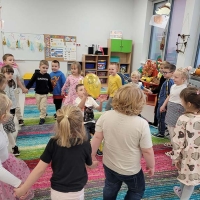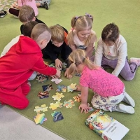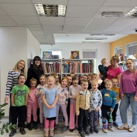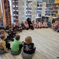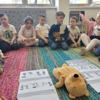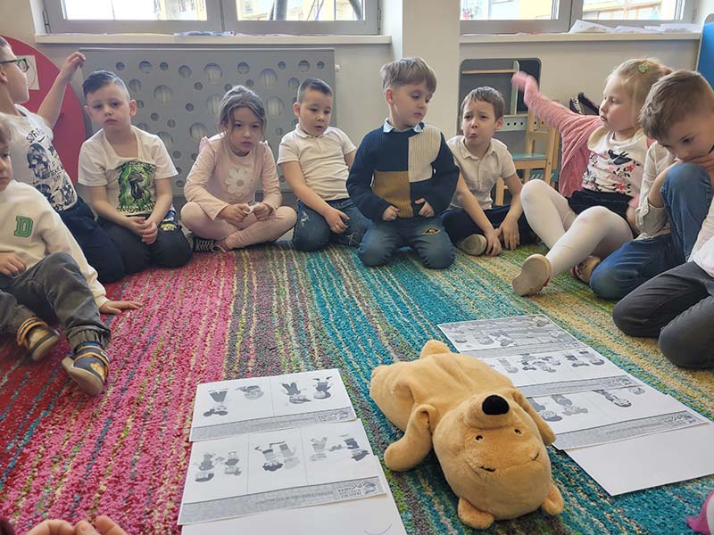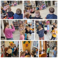 Wyjście do biblioteki miejskiej na zajęcia z okazji Światowego Dnia Zwierząt. Krasnoludki rozwiązywały zagadki, słuchały czytanej książki, oglądały film z dźwiękami wydawanymi przez zwierzęta, uczestniczyły w zabawie dźwiękonaśladowczej, oglądały książeczki, słuchały audiobooków, rysowały kredą. Dzieci na koniec stwierdziły, że chętnie wrócą do biblioteki.