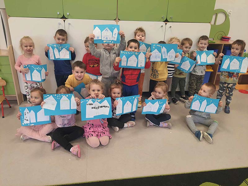 Praca plastyczna- Zimowe miasteczko. Rozwijanie motoryki malej i ekspresji. Poznanie zimowego krajobrazu.