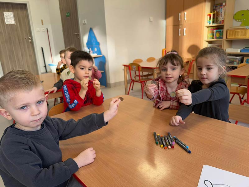 Dzieci z grupy Pszczółki i Misie wzięły udział w projekcie edukacyjnym "Mrówka Złotówka" Dzieci poznały już historię pieniądza, oraz nominały monet i banknotów. Od dzisiaj mają nową przyjaciółkę od oszczędzania "Mrówkę Złotówkę" a nawet stworzyły jej portret.