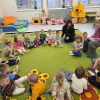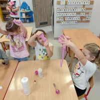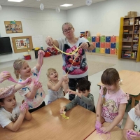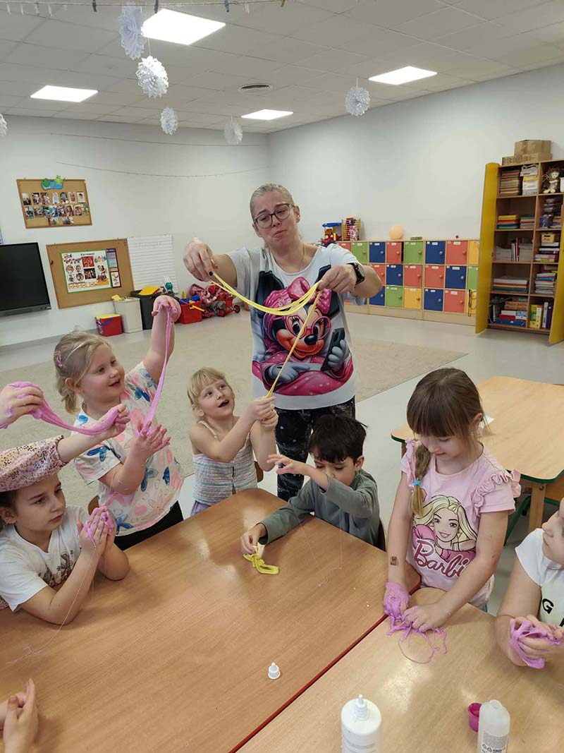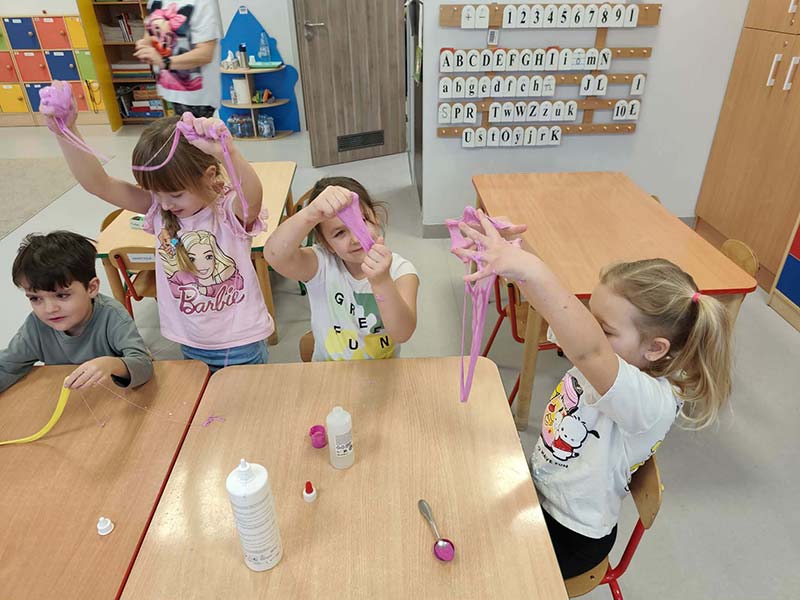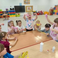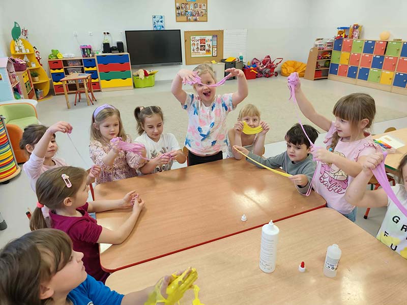 Dzieci z grupy Żabki - zajęcia polegały na samodzielnym przygotowaniu przez dzieci kolorowego slime oraz wykorzystaniu go do tworzenia obrazów i różnych kształtów. Podczas zabawy dzieci rozwijały kreatywność, sprawność manualną oraz zmysły sensoryczne.