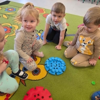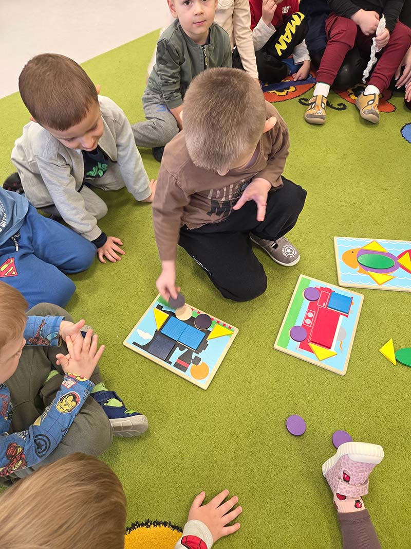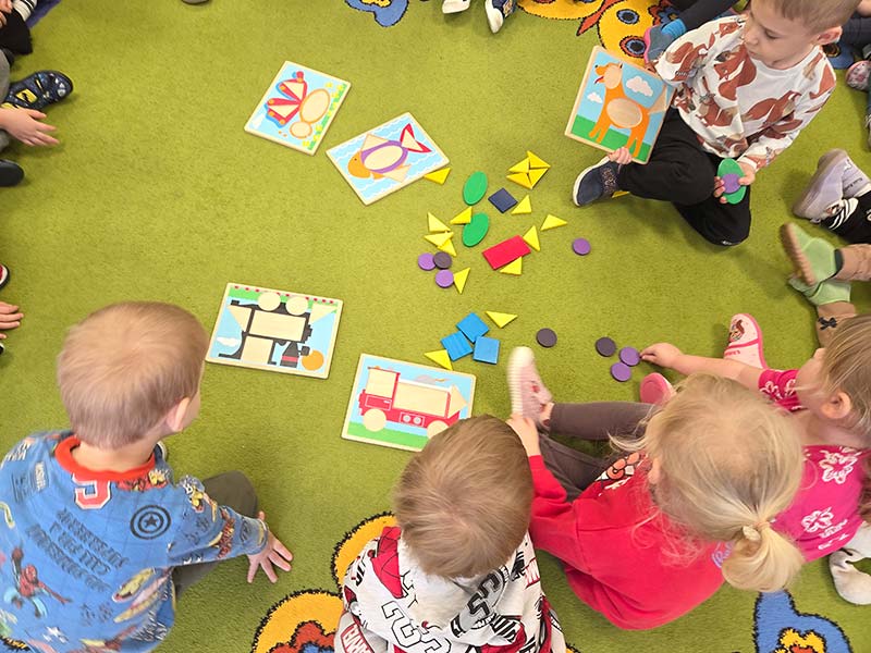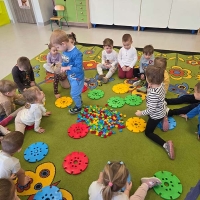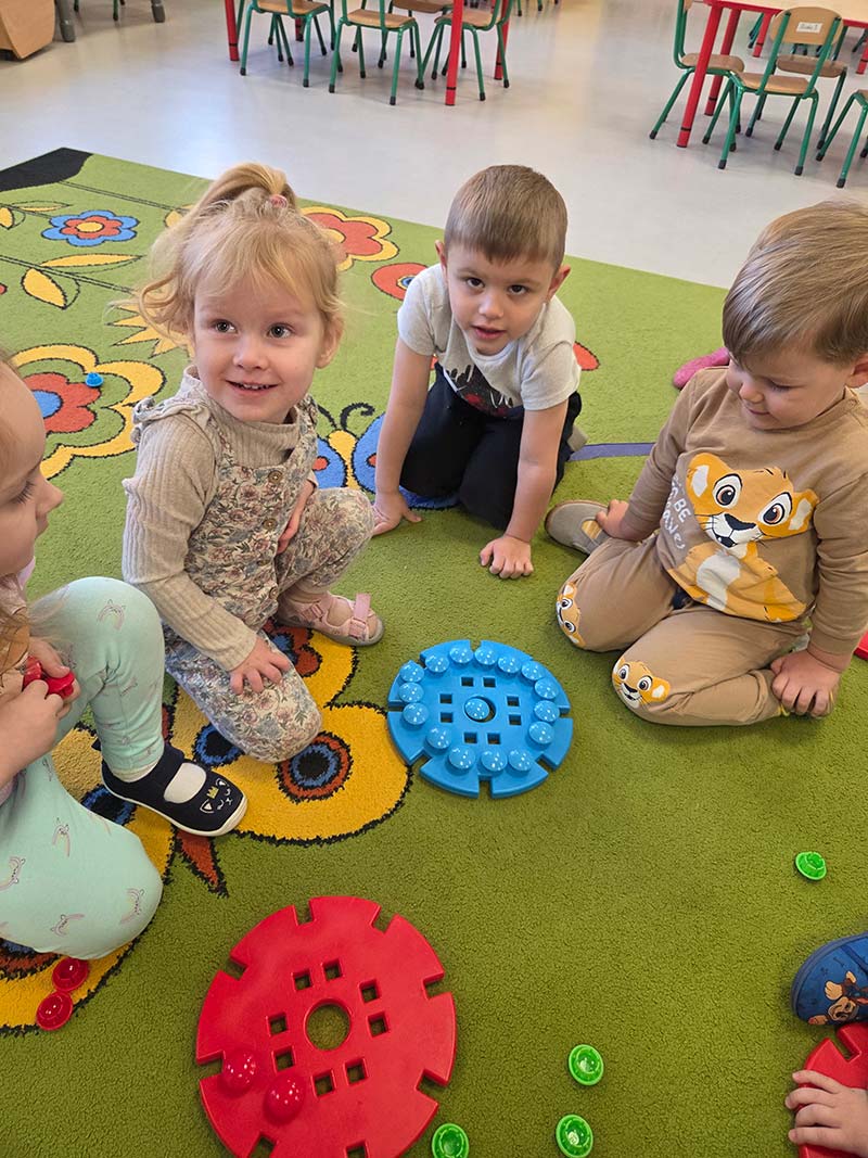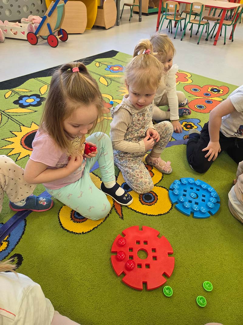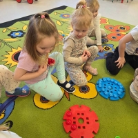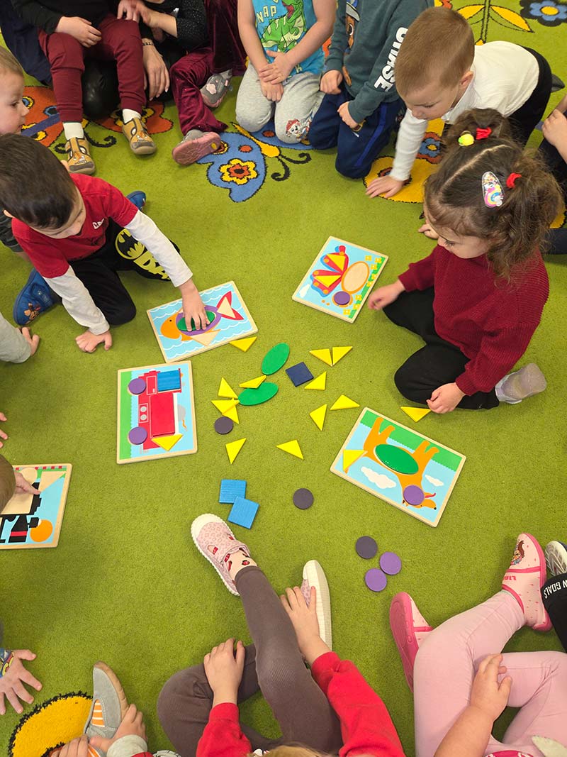 Grupa Biedronek podczas zajęć matematycznych poznaje kształty figur i klasyfikuje wg kolorów bawiąc się przy tym wesoło.