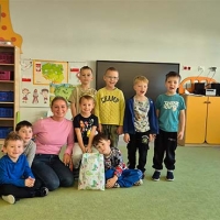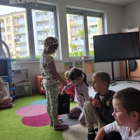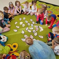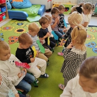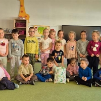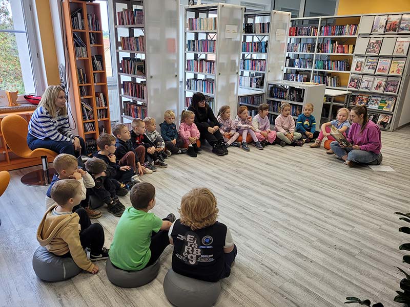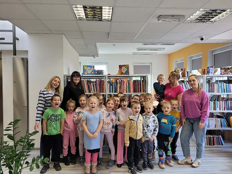 Wyjście do biblioteki miejskiej na zajęcia z okazji Światowego Dnia Zwierząt. Krasnoludki rozwiązywały zagadki, słuchały czytanej książki, oglądały film z dźwiękami wydawanymi przez zwierzęta, uczestniczyły w zabawie dźwiękonaśladowczej, oglądały książeczki, słuchały audiobooków, rysowały kredą. Dzieci na koniec stwierdziły, że chętnie wrócą do biblioteki.