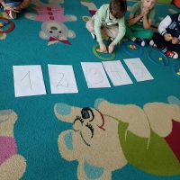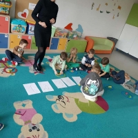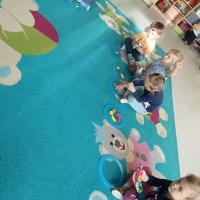 Zajęcia ruchowe z wykorzystaniem czarodziejskiego dywanu dzieci z grupy Jeżyki.