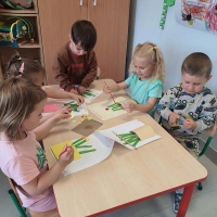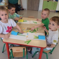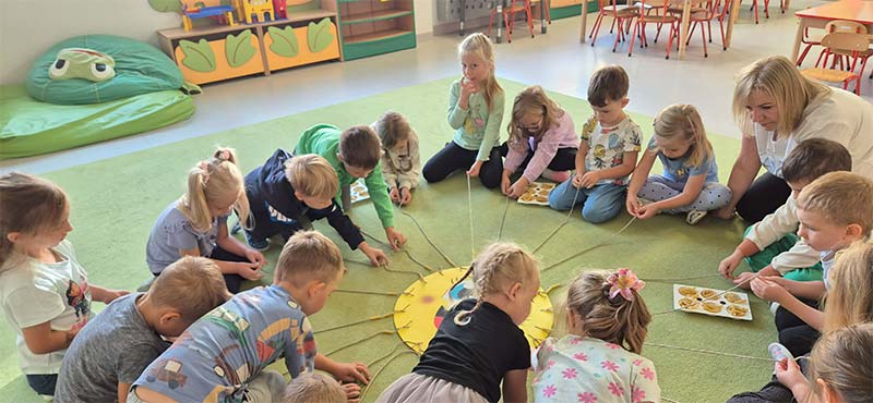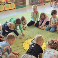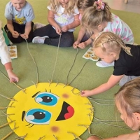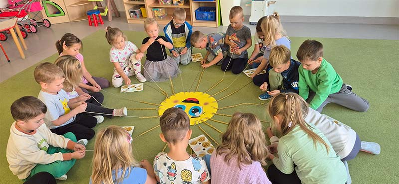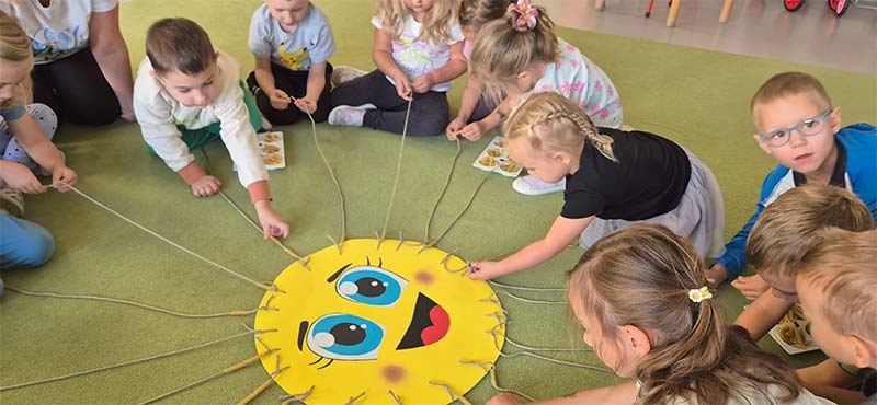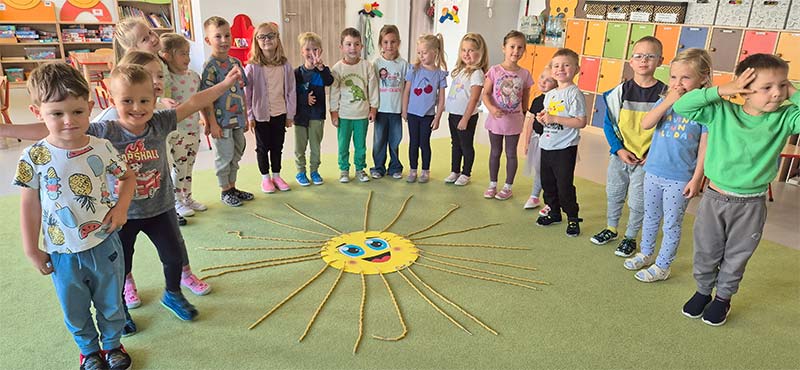 Dzieci z grupy Jeżyki nie zapominają o pięknych słonecznych dniach. Wykonały pracę rozwijającą motorykę małą, zręczności dłoni i ćwiczyły skupienie uwagi - nawlekały makaron na promienie słońca.
