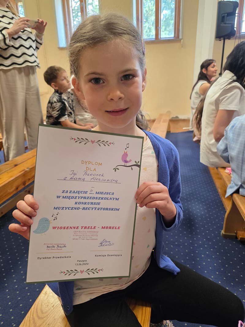 Nasza utalentowana Iga Przeorek zajęła 3 miejsce w Międzyprzedszkolnym Konkursie Muzyczno-recytatorskim "Wiosenne Trele-Morele" zorganizowanym przez Niepubliczne Przedszkole Sióstr Salezjanek w Pieszycach.
