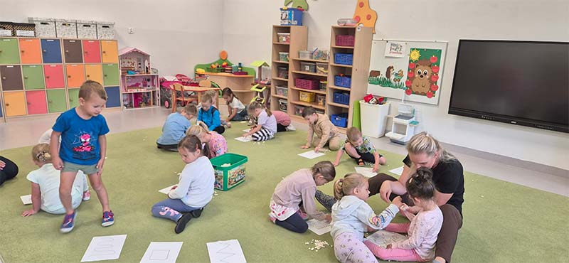 Dzieci z grupy Jeżyki chętnie uczestniczą w zajęciach - rozwijającą zręczności i skupienie uwagi - zabawa z wykorzystaniem fasoli.