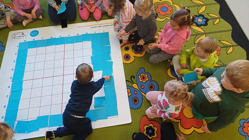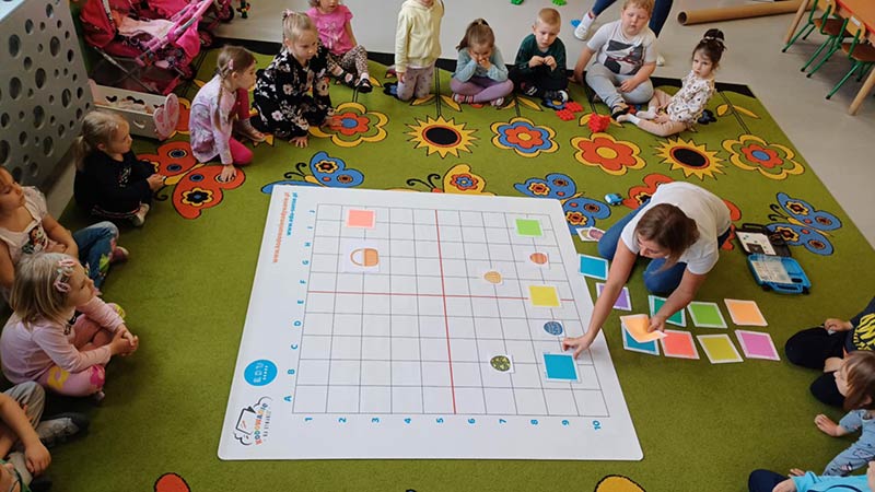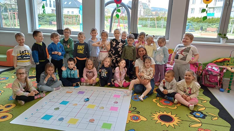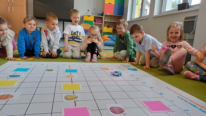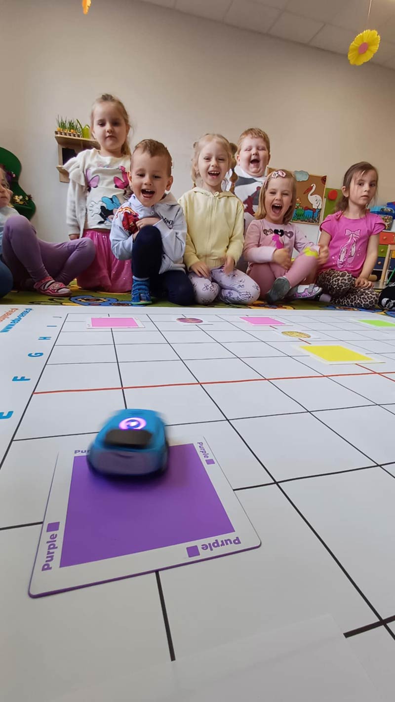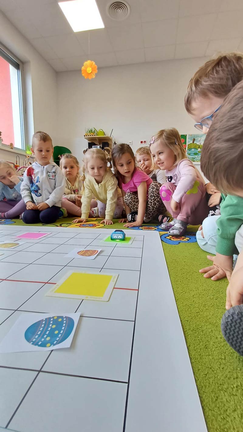 Dzieci z grupy Jeżyki uczyły się programować z robotem INDI - pisanki musiały trafić do koszyka Wielkanocnego.