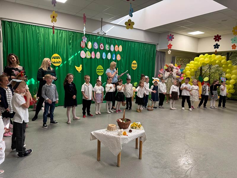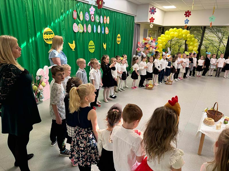 Mali artyści z ogromnym zaangażowaniem i dziecięcą szczerością opowiedzieli o tradycjach wielkanocnych – były rymowanki, piosenki, taniec z pisankami, a nawet scenki z udziałem zajączka wielkanocnego i kurczaczków. Dzieci wykazały się nie tylko odwagą sceniczną, ale też wyjątkową pamięcią i radością płynącą z występu. Atmosfera była pełna ciepła, uśmiechu i świątecznej nadziei.
