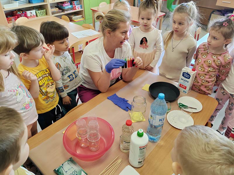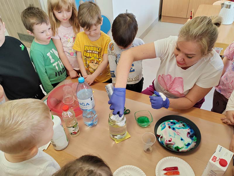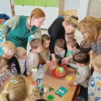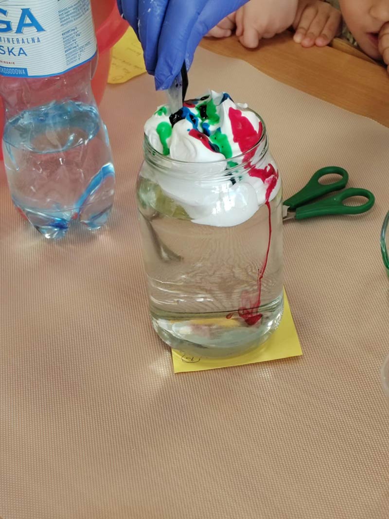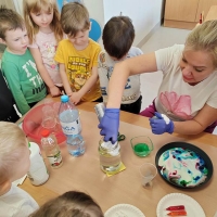 Dzieci z grupy "Pszczółki" wzięły udział w ciekawych zabawach dydaktycznych połączonych z kolorowymi doświadczeniami. Celem zajęć było nie tylko rozwijanie ciekawości poznawczej, ale także utrwalenie nazw kolorów poprzez obserwację prostych eksperymentów. Przedszkolaki z ogromnym zaangażowaniem mieszały barwy, obserwowały zmiany i wyciągały własne wnioski. Zabawa z kolorami dostarczyła wielu emocji i była doskonałą okazją do nauki poprzez działanie i doświadczenie.