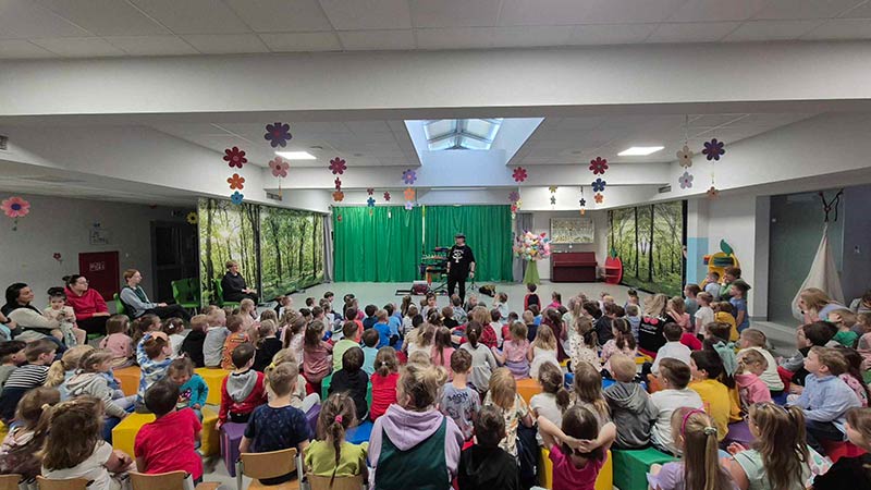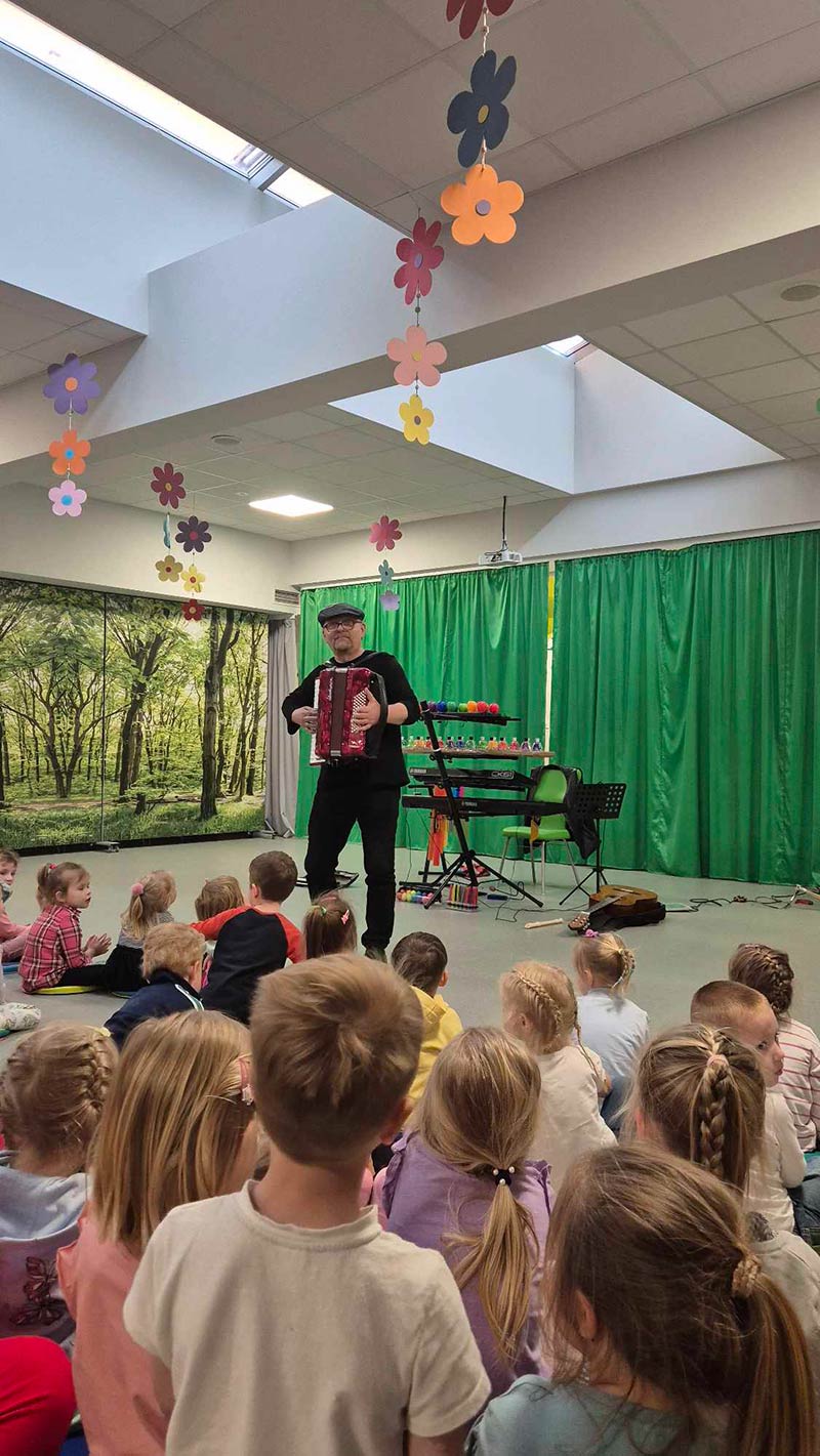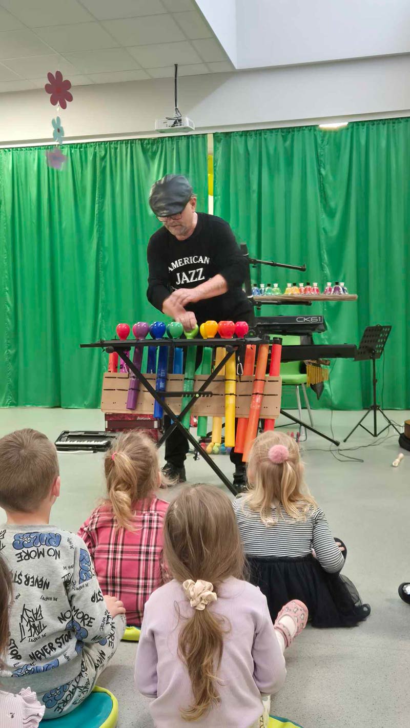 Prowadzący z dużym zaangażowaniem i poczuciem humoru wciągnął dzieci w świat muzyki, prezentując różnorodne instrumenty oraz możliwości ich wykorzystania. Przedszkolaki mogły nie tylko słuchać, ale również aktywnie uczestniczyć — klaskać i rytmicznie powtarzać dźwięki.