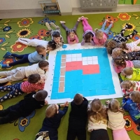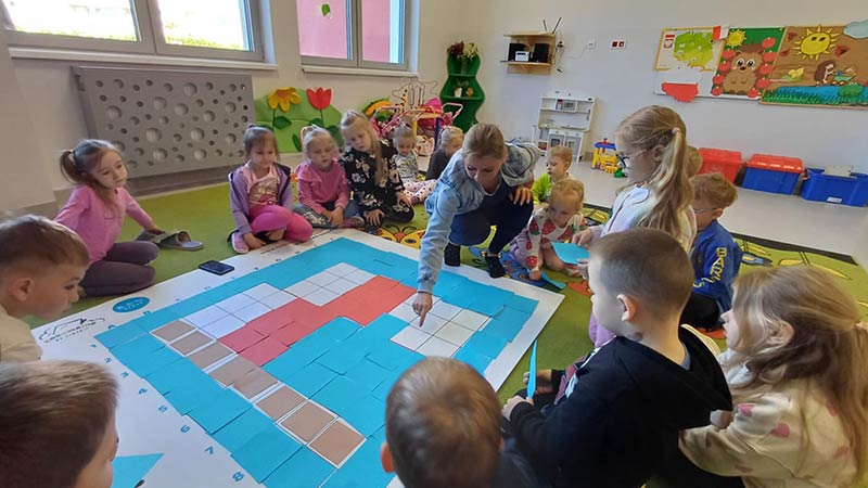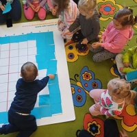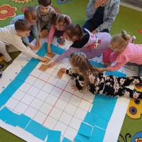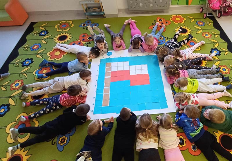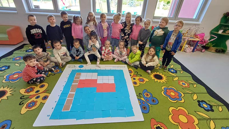 Dzieci z grupy Jeżyki poznają symbole narodowe. Podczas zajęć zakodowały Flagę Polski.