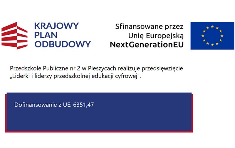 Grant uzyskano w ramach Przedsięwzięcia pn. “Liderki i liderzy przedszkolnej edukacji cyfrowej” dofinansowanego z Krajowego Planu Odbudowy i Wzmacniania Odporności, finansowanego ze środków Instrumentu na Rzecz Odbudowy i Wzmacniania Odporności oraz Unii Europejskiej – NextGenerationEU, Komponent C: Transformacja cyfrowa, Reforma: C2.1: Zwiększenie skali zastosowań rozwiązań cyfrowych w sferze publicznej, gospodarce i społeczeństwie, Inwestycja C2.1.3: E-kompetencje, w ramach umowy o dofinansowanie numer KPOD.05.08-IW.06-0076/24.